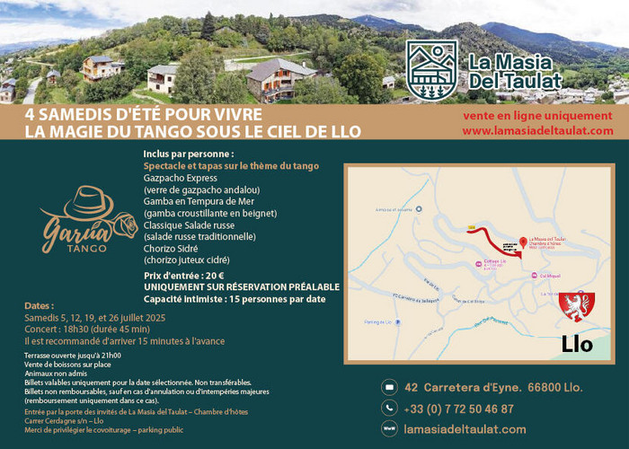 4 samedis d'été pour vivre la magie du tango sous le ciel de Llo ! Samedi 5, 12, 19 et 26 juillet…