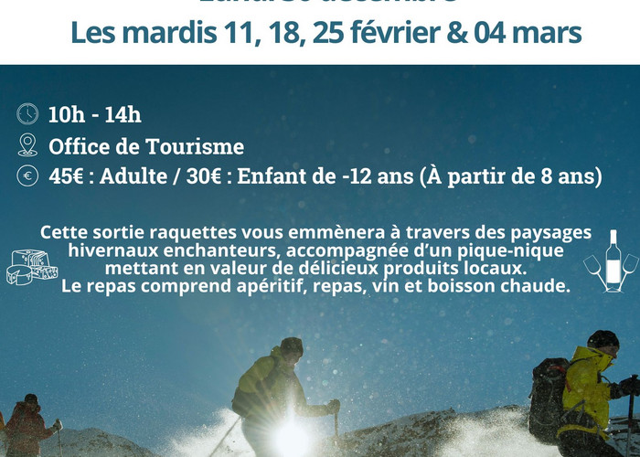 SORTIE RAQUETTES ET DÉCOUVERTE DES PRODUITS RÉGIONAUX 10H - 14H Rendez-vous Office de Tourisme,…