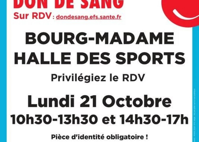 Lundi 21 octobre de 10h30 à 13h30 et de 14h30 à 17h à la Halle des sports de Bourg Madame. DON DE…