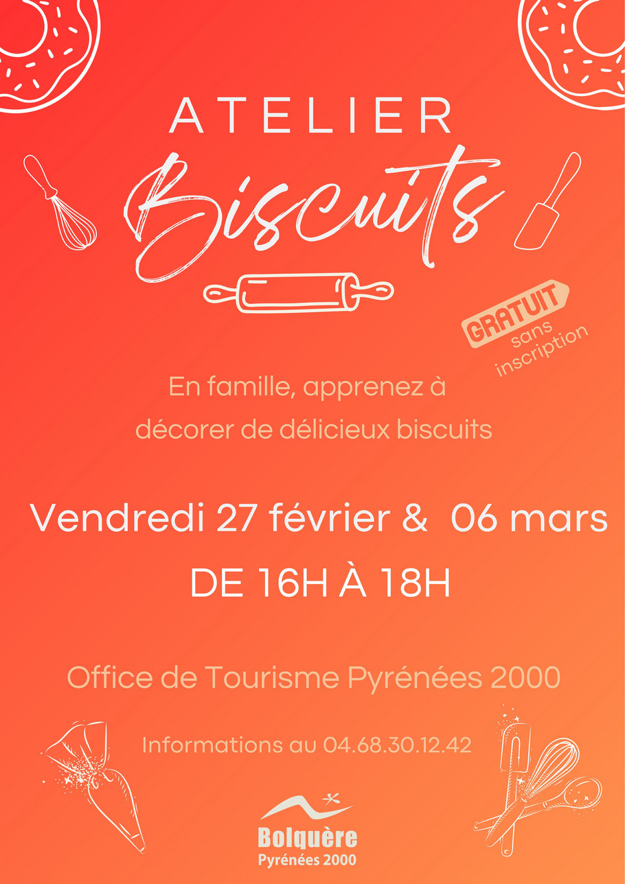 ATELIER PÂTISSERIE 15h - 17h30 Office de Tourisme de Bolquère Pyrénées 2000 Gratuit | Sans inscription Apprenez à décorer de délicieux biscuits !
