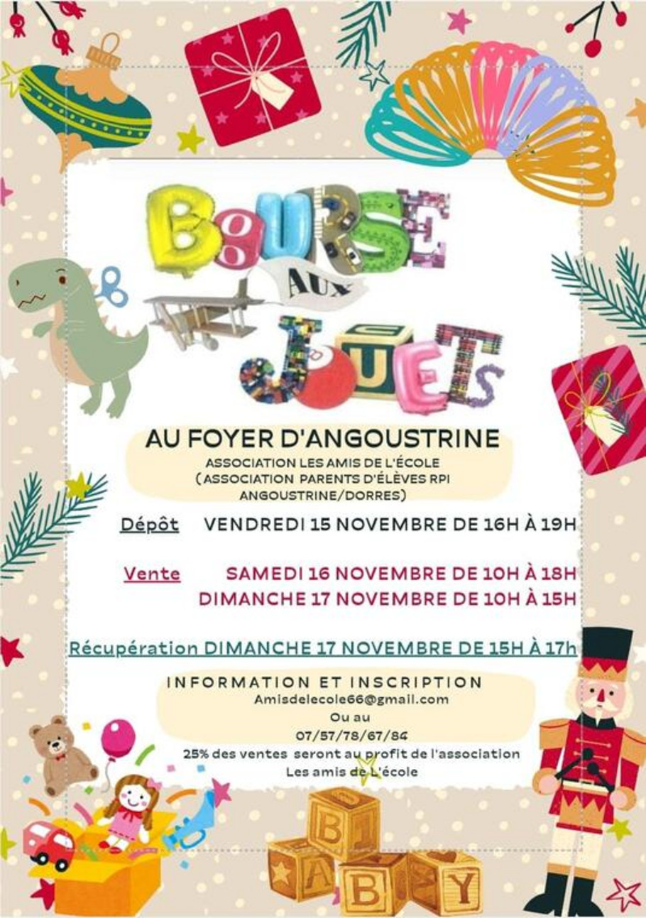 L'association les amis de l'école organise une bourse aux jouets. 25% des ventes seront au profit de l'association. Du 16/11/2024 au 17/11/2024 Retour