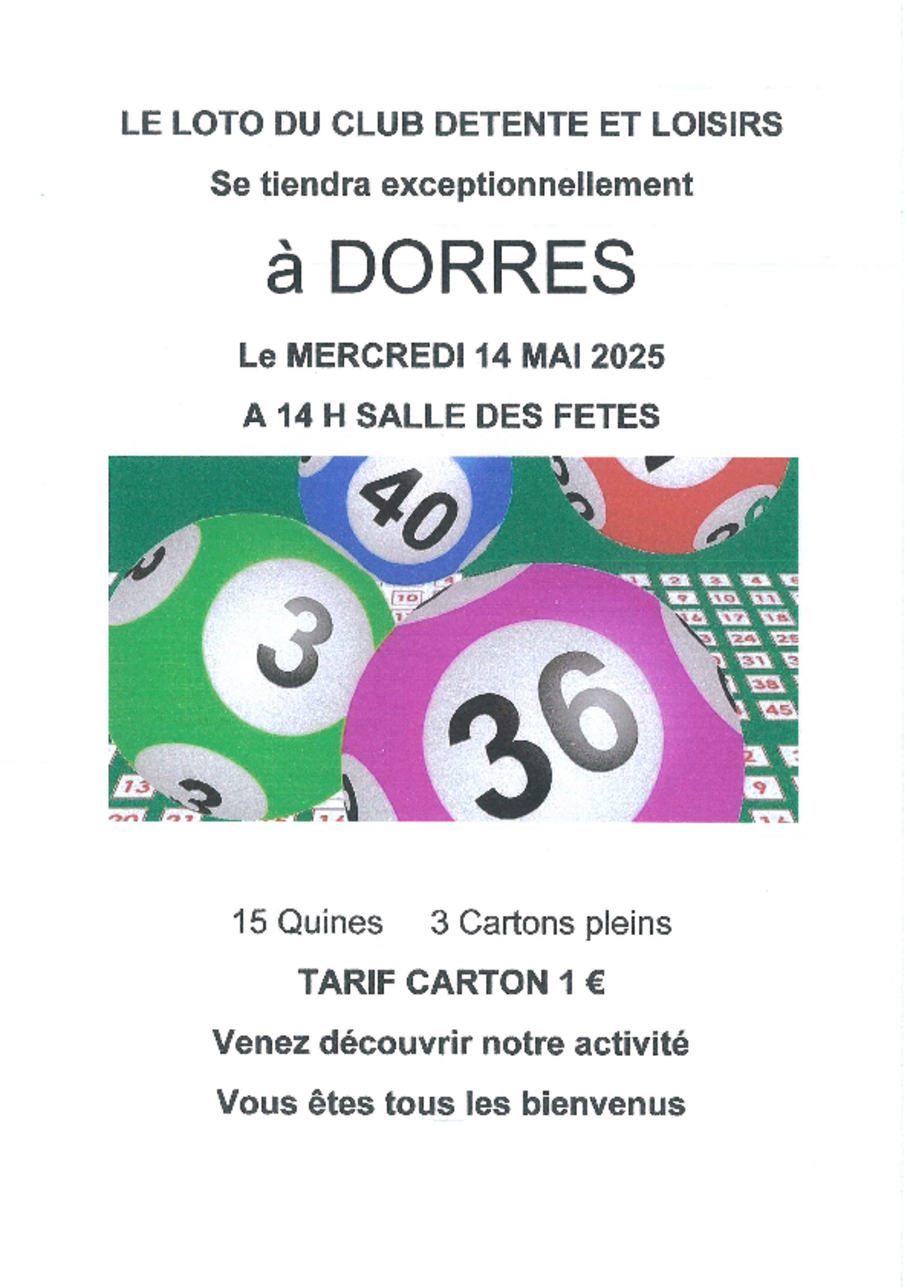 Le mercredi 14 mai 2025 à 14h à la salle des fêtes de Dorres 15 quines 3 cartons pleins Tarif du carton: 1 euro 05-14-2025 Back