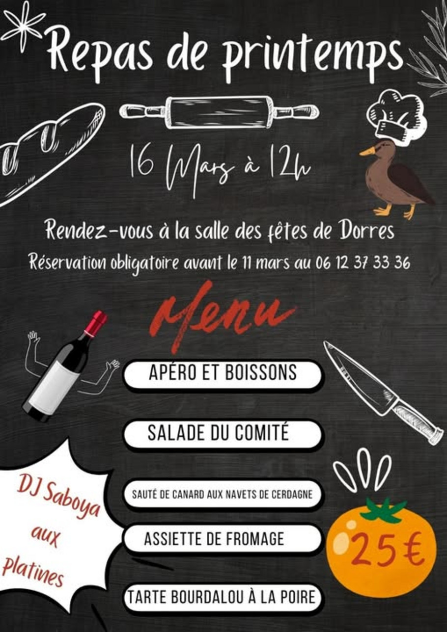 Le repas de printemps se tiendra le dimanche 16 mars à 12h à la salle polyvalente de Dorres. 03-16-2025 Back